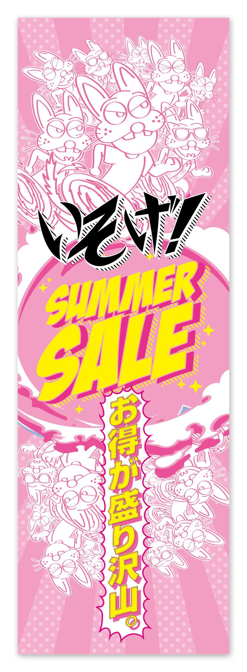 ユニークでポップなイラストで「個性的なショップ」を演出いたします。他店とは違う「のぼり旗」で目を引きつけ、夏のセールを盛り上げます。有料でイラストをお好みに変更する事も可能ですので、お問い合わせください。