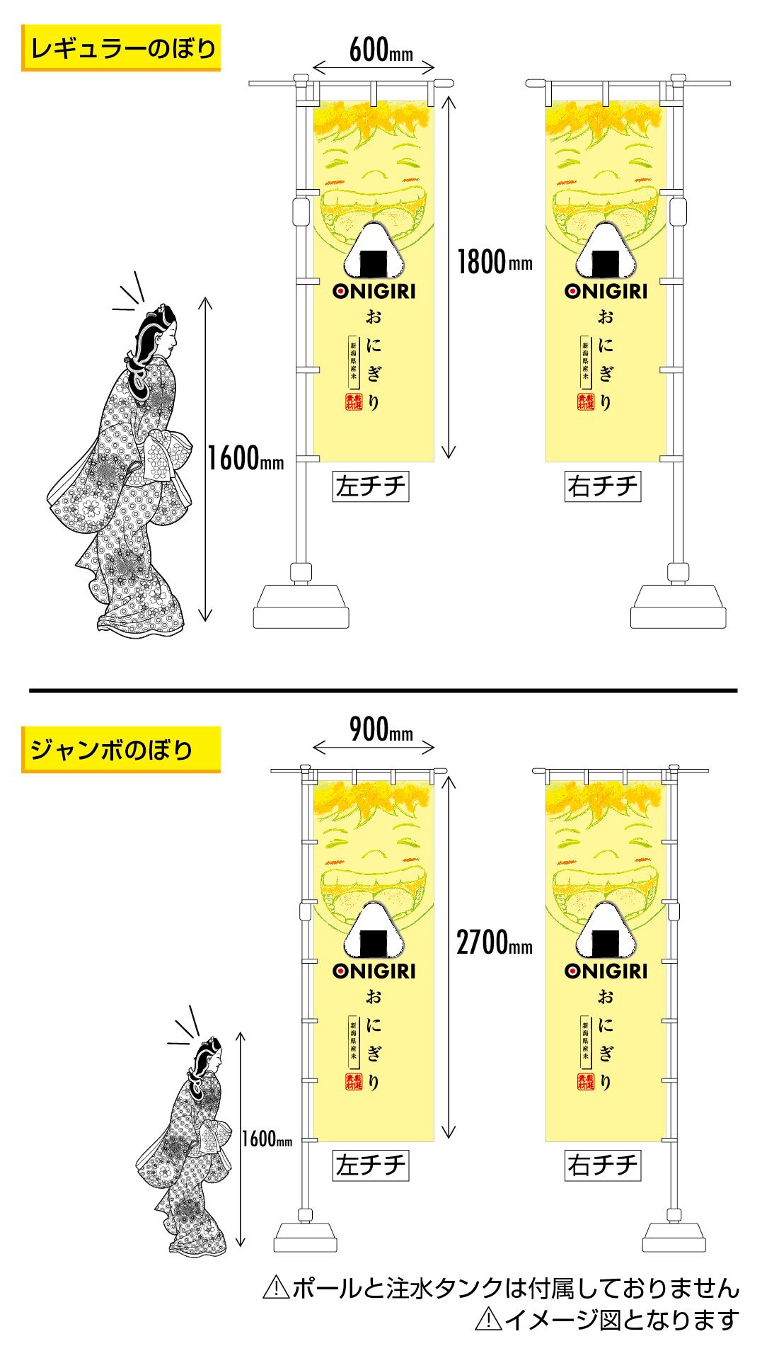 シンプルなレイアウトが目を引く「のぼり旗」です。冷たくなりがちなミニマルなデザインですが、嬉しそうに「おにぎり」を食べようとするイラストが温かみのある「のぼり旗」へ変容しています。お店の名入れなどカスタマイズも承っておりますので、お気軽にお問い合わせください。